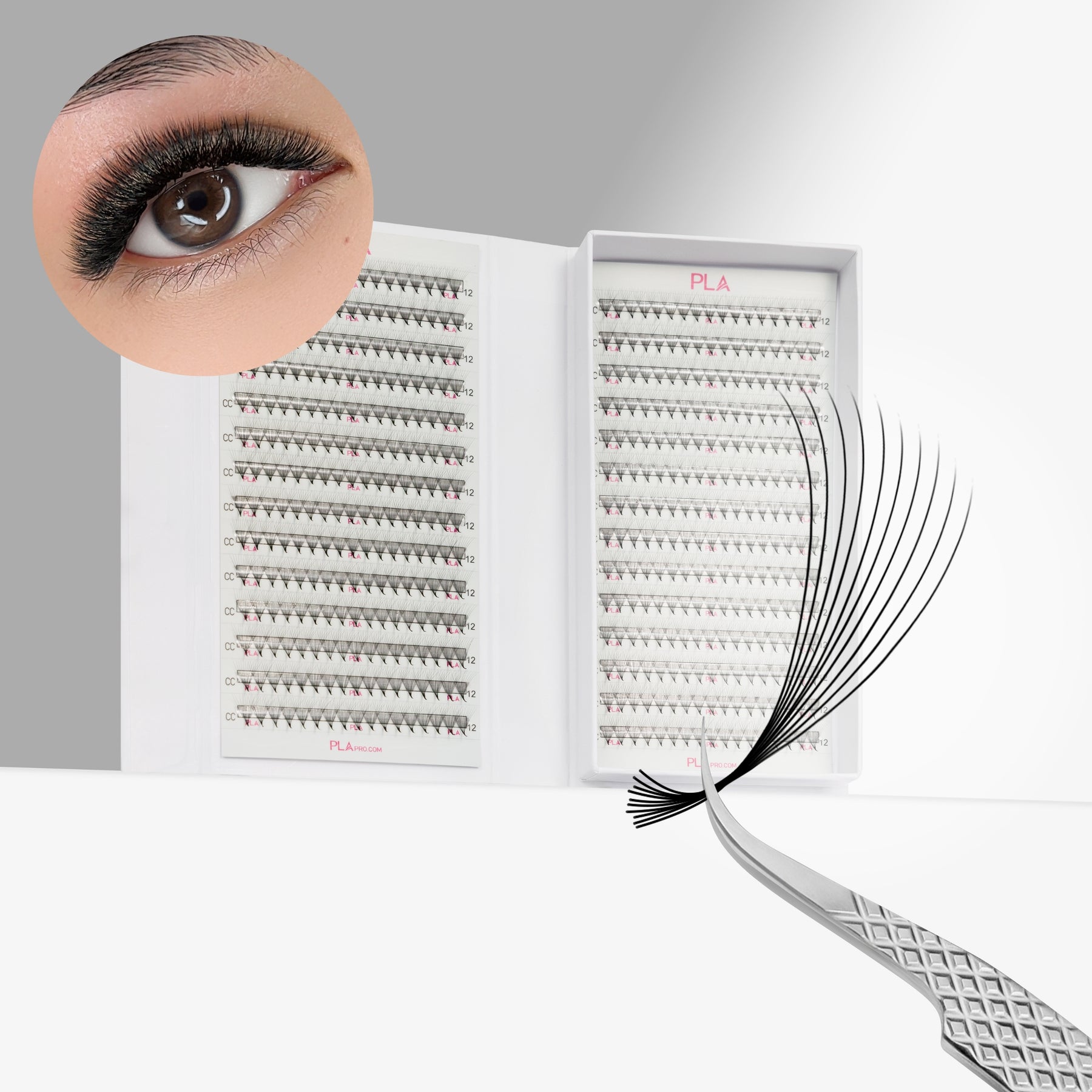PLA ProMade Lashes — 2.0 (front of open lash box and close up view of the fan)