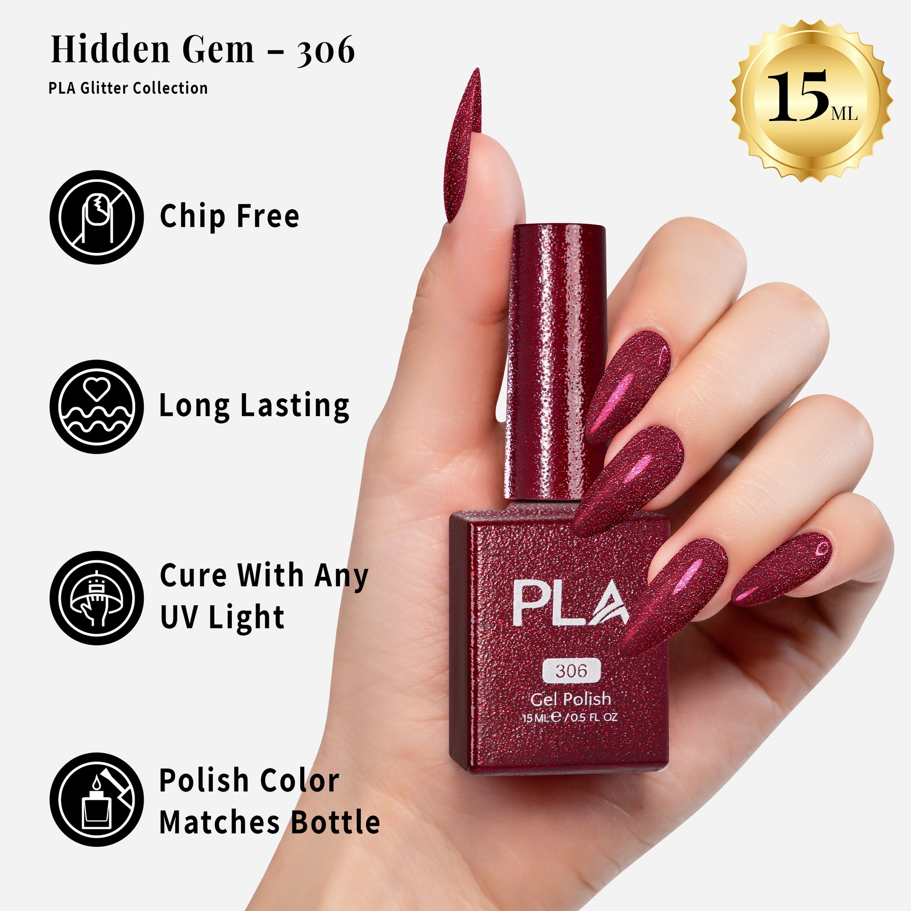 El Esmalte de Gel con Purpurina Hidden Gem de PLA puede usarse en un sistema profesional de gel de 3 pasos. Después de aplicar la base, cura el esmalte de gel bajo una lámpara LED durante 60 segundos, finalizando con la capa superior. Recomendamos dos capas de esmalte.