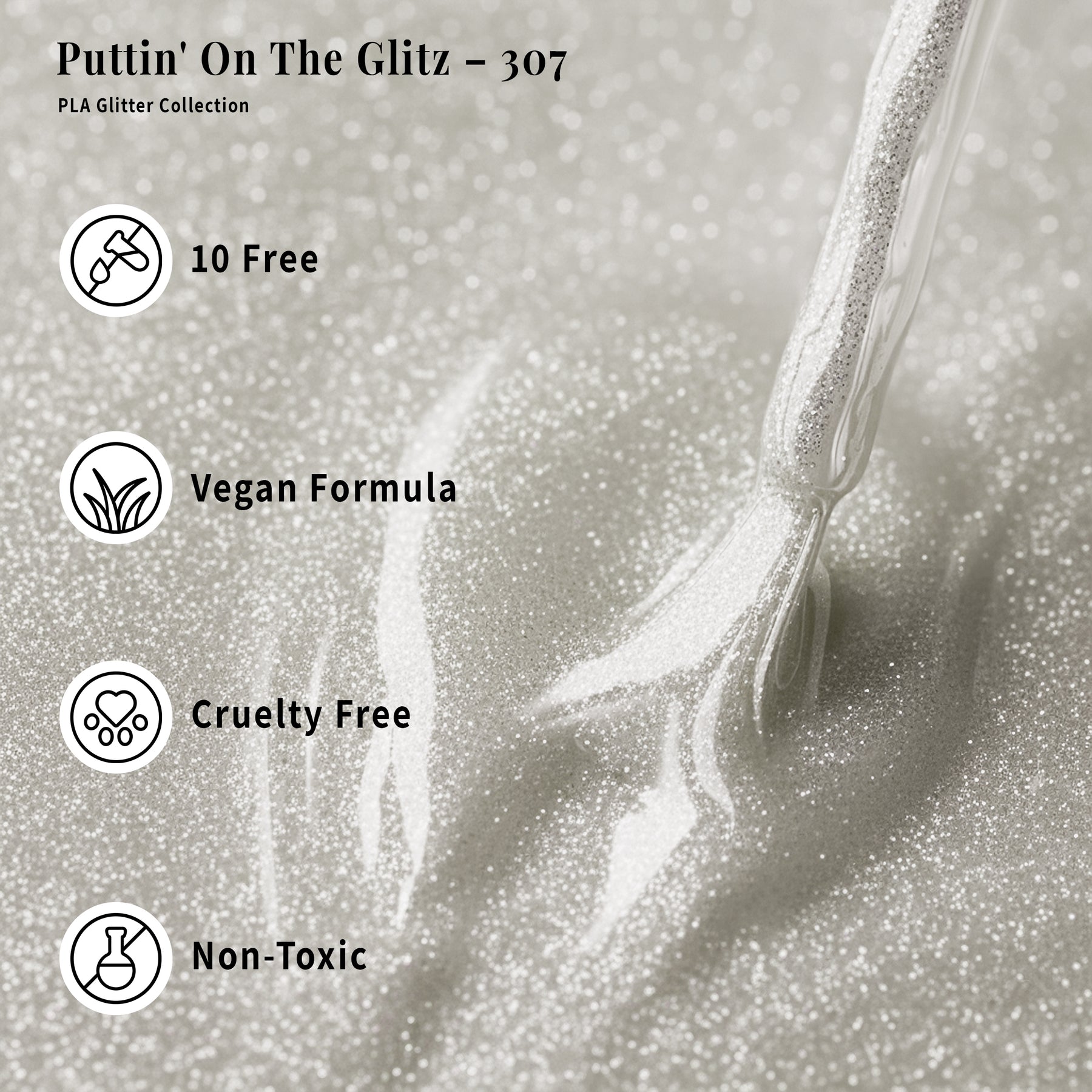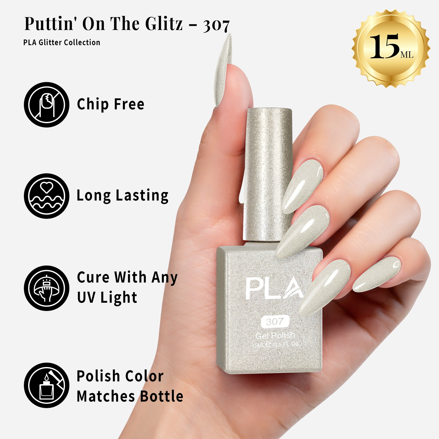 El esmalte de gel PLA Puttin' On The Glitz Glitter Gel puede usarse para un sistema profesional de gel en 3 pasos. Después de aplicar la base, cura el esmalte de gel bajo una lámpara LED durante 60 segundos, terminando con la capa superior. Recomendamos dos capas de esmalte.